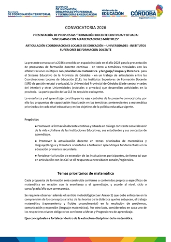 PRESENTACIÓN DE PROPUESTAS “FORMACIÓN DOCENTE CONTINUA Y SITUADA: ARTICULACIÓN COORDINACIONES LOCALES DE EDUCACIÓN – INSTITUTOS SUPERIORES DE FORMACIÓN DOCENTE” | 2026